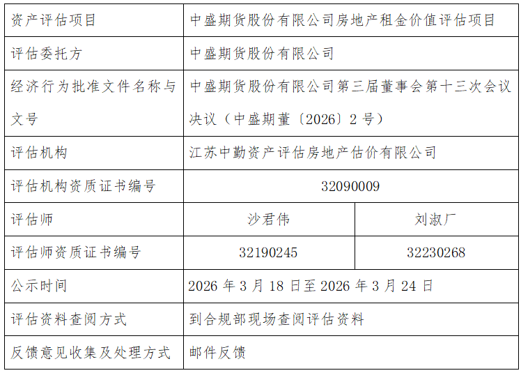 根据《徐州市市属国有企业资产评估工作管理办法》的有关规定,现就中盛期货股份有限公司房地产市场租金价值评估项目进行公示,具体内容如下: