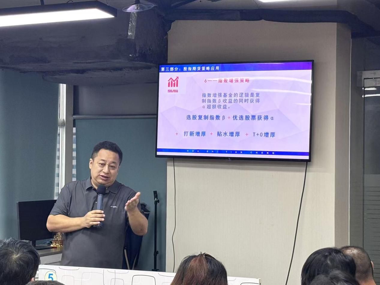 随后,深圳市厚石天成投资管理有限公司创始人、投资总监侯延军老师结合自身多年市场经验,从股指期货策略应用、期权相关知识和使用技巧方面展开演讲,并与投资者进行了深入沟通交流。