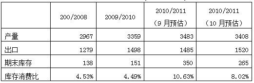 USDA在10月报告中将2010/2011年美豆产量和期末库存双双下调,同时由于需求数据上调,导致美豆库存消费比进入历史低位,美豆供需转向偏紧格局。根据USDA报告,截止到10月24日当周,美豆收割率达到91%。收割完毕意味着产量尘埃落定,之前给予市场的压力将得到释放。根据历史数据统计,11月报告中的产量预估倾向于比10月报告低。这从11月美豆合约在1200美分以上的坚挺程度可见一斑。