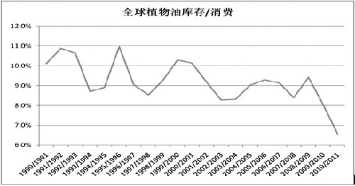 对于大豆这个品种来说,由于目前和玉米的比价依然没有优势,即便是在下一年度,大豆供应偏紧的局面依然难以缓解,全球植物油的库存消费比也是近20年来最低的一年(如下图所示),这就是我们前期一直看多豆类或者油脂市场的一个非常重要的因素。2010/2011年度全球植物油库存消费比为6.6%,2007/2008年度为8.6%,这些足以让市场认为植物油市场是一个牛市,而且基础比较牢固,因此市场对近期的阿根廷干旱天气炒作比较厉害。预计后期整个压榨利润要更多得益于油脂。