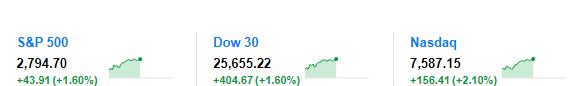 开盘三个小时,道指涨400点,涨幅扩大至1.6%。标普500涨1.6%,11个板块全线上扬,纳指涨约160点或2.1%。