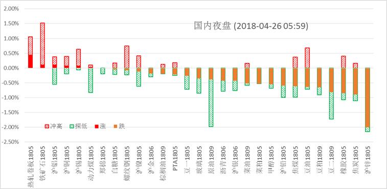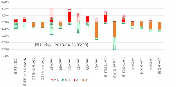周三夜间,标普涨0.18%;道指涨0.25%;欧洲Stoxx50指数跌0.76%;美元指数涨0.51%;伦铜跌0.07%;原油涨0.46%;黄金跌0.65%。美豆涨0.39%;美豆粉涨1.17%;美豆油跌0.70%;美糖跌2.02%;美棉涨2.85%;CRB指数涨0.30%;BDI指数涨3.46%。离岸人民币CNH跌0.36%报6.3221。大连铁矿石1809跌1.28%,大连焦炭1809跌0.93%,上海螺纹钢1810跌0.48%,上海原油1809跌0.38%。