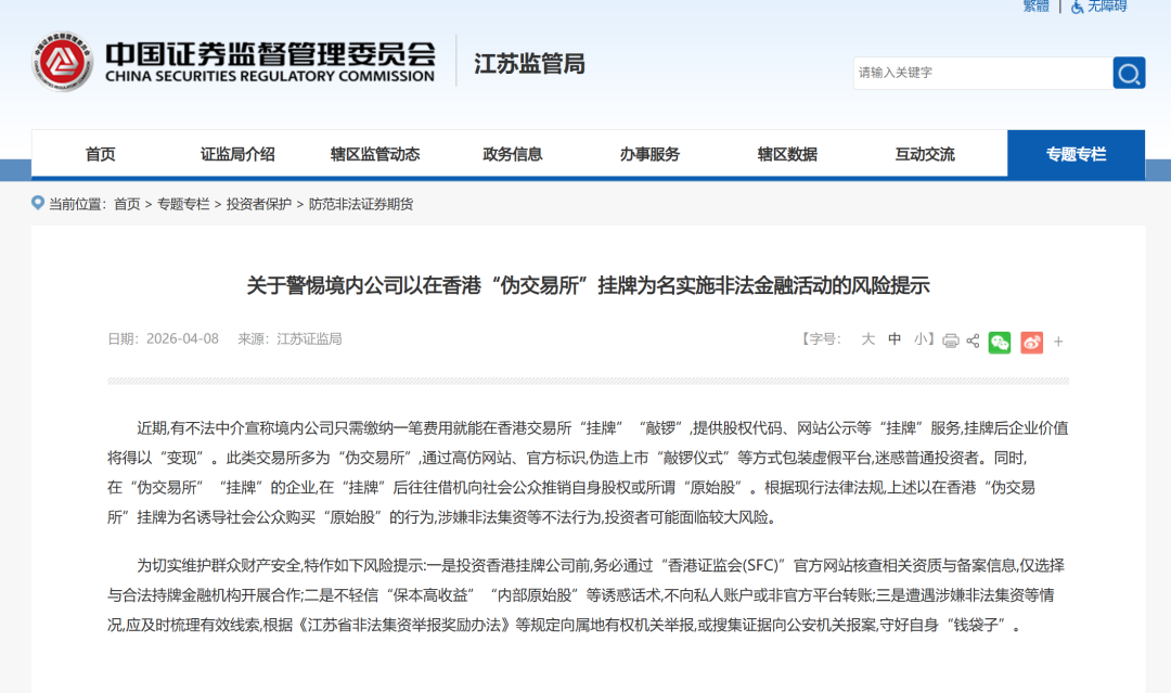 近期,有不法中介宣称境内公司只需缴纳一笔费用就能在香港交易所“挂牌”“敲锣”,提供股权代码、网站公示等“挂牌”服务,挂牌后企业价值将得以“变现”。此类交易所多为“伪交易所”,通过高仿网站、官方标识,伪造上市“敲锣仪式”等方式包装虚假平台,迷惑普通投资者。同时,在“伪交易所”“挂牌”的企业,在“挂牌”后往往借机向社会公众推销自身股权或所谓“原始股”。根据现行法律法规,上述以在香港“伪交易所”挂牌为名诱导社会公众购买“原始股”的行为,涉嫌非法集资等不法行为,投资者可能面临较大风险。