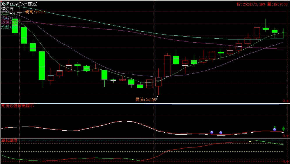 图1 1109合约15分钟K线及必盈三线、潮起潮落指标