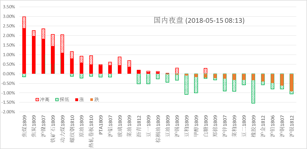 周一夜间,标普涨0.09%;道指涨0.27%;欧洲Stoxx50指数涨0.01%;美元指数涨0.12%;伦铜跌0.55%;原油涨0.66%;黄金跌0.57%。美豆涨1.44%;美豆粉涨2.30%;美豆油跌0.03%;美糖涨0.36%;美棉跌0.86%;CRB指数涨0.14%;BDI指数涨0.27%。离岸人民币CNH跌0.05%报6.3373;大连铁矿石1809涨1.45%,大连焦炭1809涨1.97%,上海螺纹钢1810涨0.79%,上海原油1809涨0.58%。