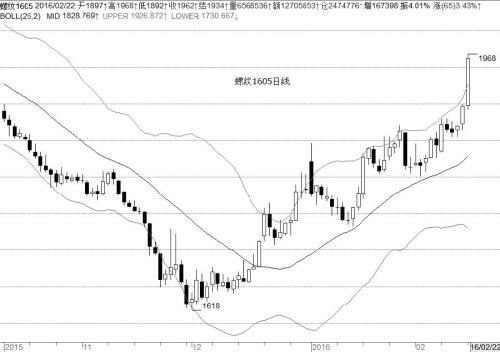 螺纹钢1605合约经历短暂蓄势后,上周五突破近期振荡区间上沿压力位1870元/吨,期价随后快速上行突破布林线上轨,持仓、成交量同步放大显示螺纹钢当前处于加速上行阶段。短线指标呈现上涨放量、调整缩量的良好氛围,这就是稳健上行特征。操作上,有老多单只要收盘价不跌破布林线上轨就继续持有,没有持仓者待日内筑造调整小平台时,以平台下沿做防守适度参与多单。