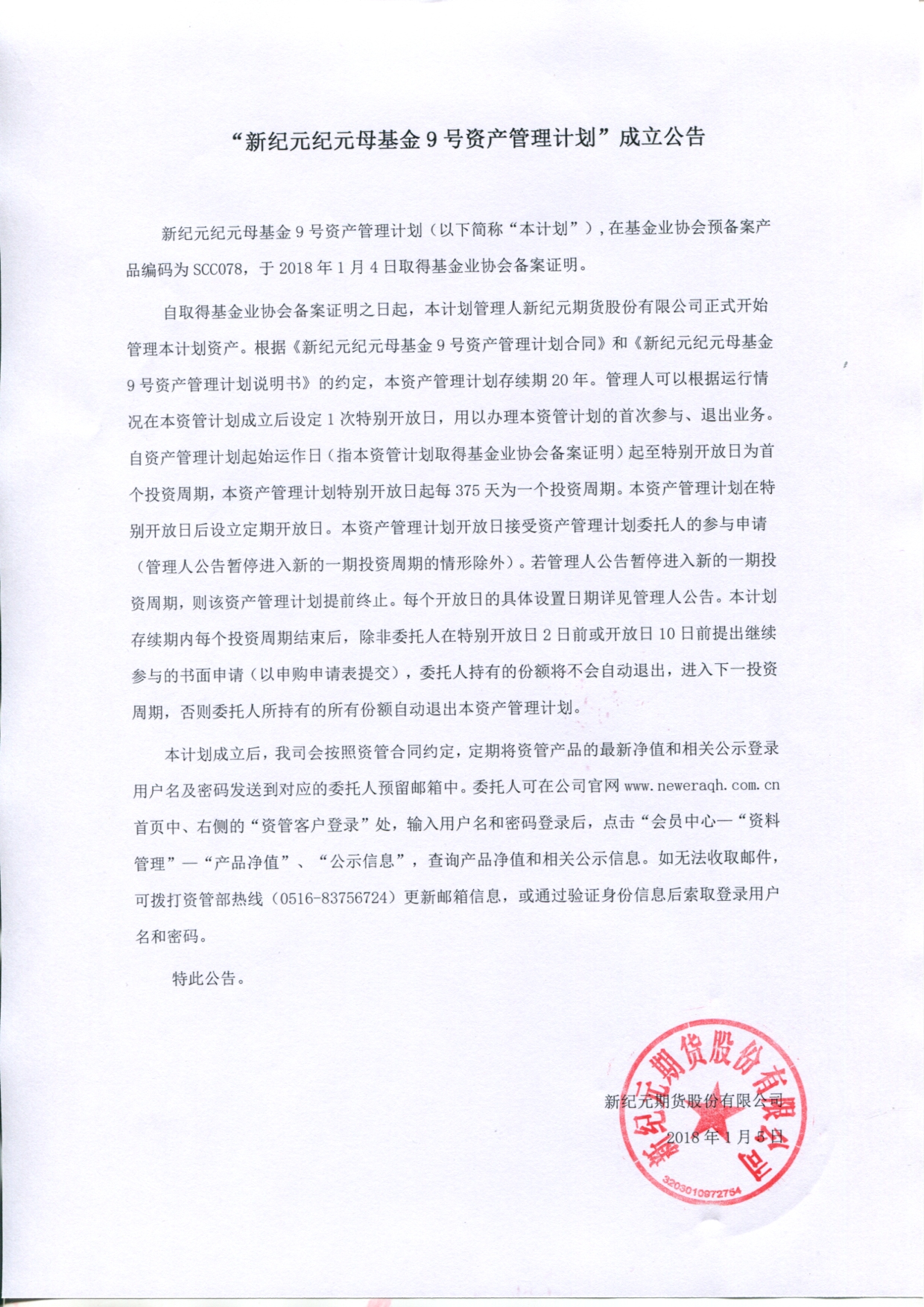 “新纪元纪元母基金9号资产管理计划”成立公告