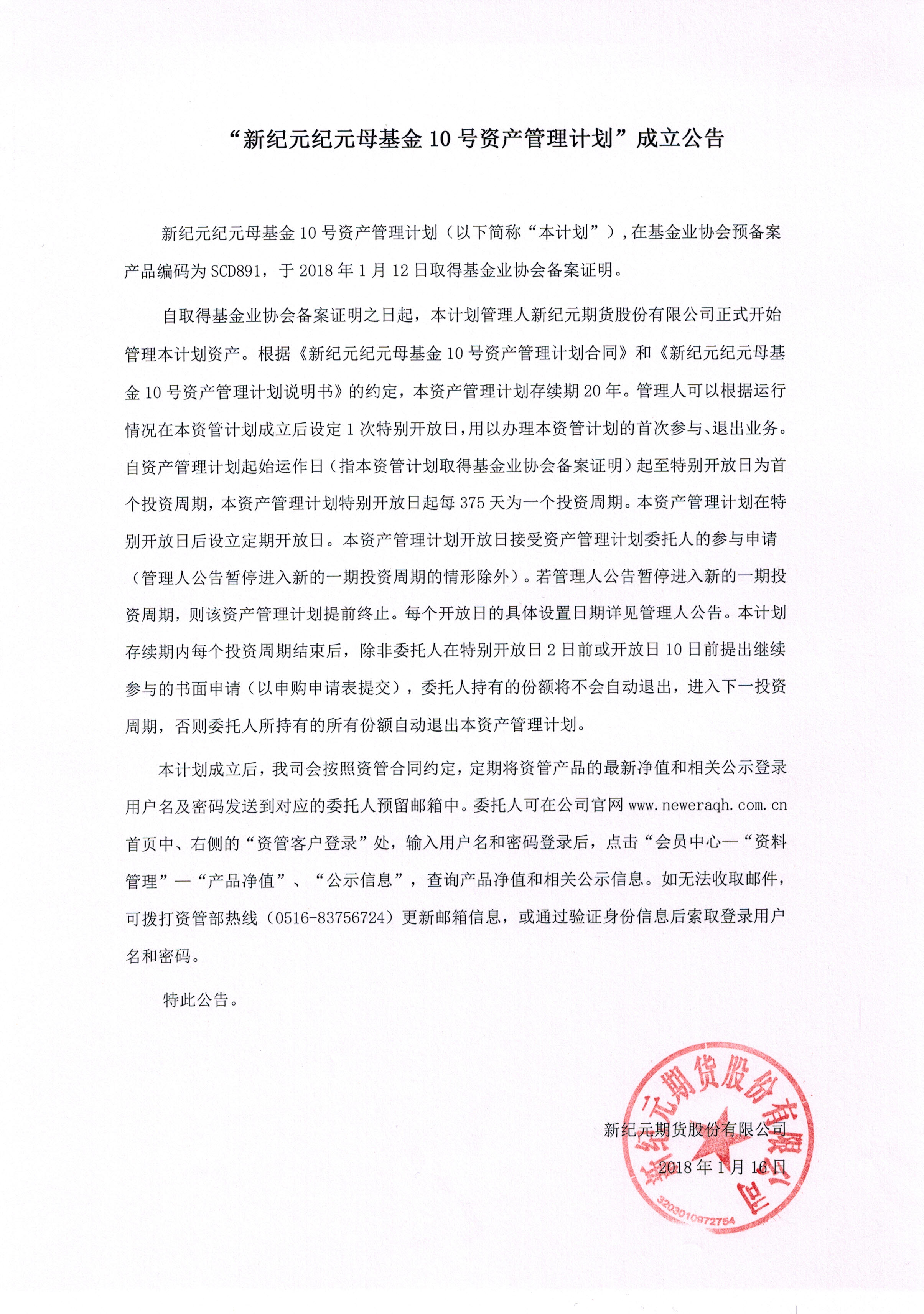 “新纪元纪元母基金10号资产管理计划”成立公告