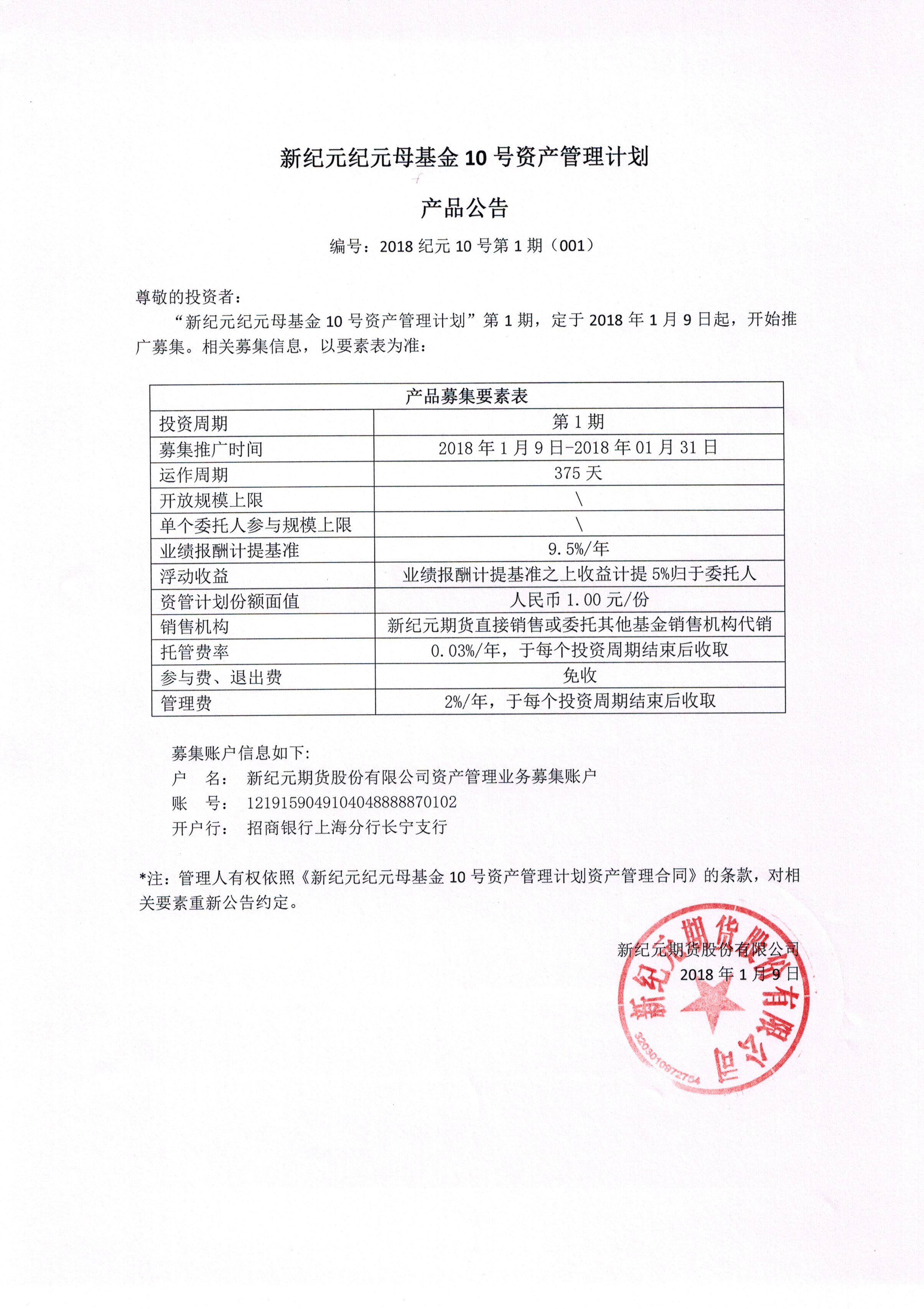 新纪元纪元母基金10号资产管理计划-公告第1期(001)