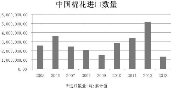 据中国海关统计,2013年3月份,我国进口棉花52.88万吨,环比增加15.01万吨,增幅为39.63%,但同比减少9.55万吨,减幅为15.3%。且今年1—3月份,我国累计进口棉花136.51万吨,同比也减少20.22万吨,减幅约12.9%。另外,2011年和2012年两个自然年度棉花累计进口量分别达336.50万吨、513.77万吨,同比均大幅增加。分析认为,稳定棉价需抑制棉花进口,且经过前两年大规模进口棉花后,预计本年度棉花总进口量将降至350万吨左右水平。