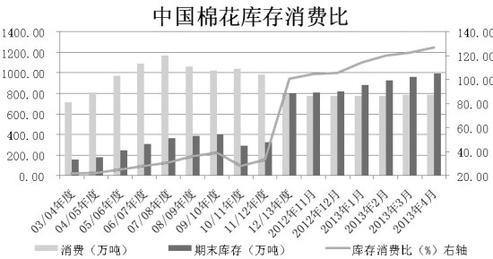 最新美国农业部供需报告再次上调了2012/2013年度中国棉花的期末库存量至993.06万吨,环比增加32.66万吨,增幅为3.4%,而产量及消费总量则维持不变,则本年度中国棉花的库存消费比达126.69%,继续上升并再创历史新高。棉花库存消费比再攀高位,说明棉市供需过剩格局在延续,且国内近1000万吨的巨大库存量是主因。