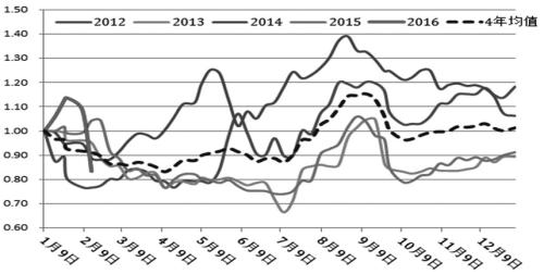 截至2月23日,全国鸡蛋棚前交易均价为6.25元/千克,同比下降21.5%,环比下降5.5%。节后鸡蛋供应明显充裕,需求转淡,节后蛋价迎来大跌,蛋鸡全程养殖利润自节前的13.08元/只回落至12元/只。由于去年年中蛋鸡补栏量较大,鸡蛋上半年仍大概率处于供给过剩的格局,下半年或许才会改善。结合以上分析,从历年蛋价波动走势来看,蛋价将继续回落并持续到4月初。不过,随着节后城市消费需求量的回升,预估鸡蛋价格未来一个月将在5.8—6.0元/千克区间运行,期货盘面上继续以逢高抛空和买1609合约抛1605合约思路操作。