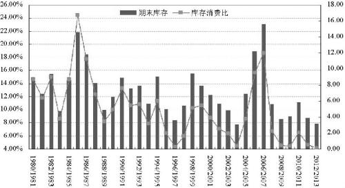 美国大豆期末库存与库存消费比变动(单位:百万吨;%)