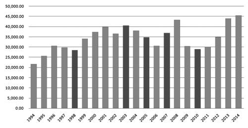 图为近20年全球白糖期末库存(深色柱状年份出现厄尔尼诺现象)