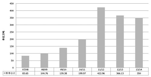 来宾一糖厂工作人员介绍,来宾地区在2007年高峰期时甘蔗种植面积一度达到27万亩,而今年只有18万亩。再从甘蔗的生长情况来看,当前雨水偏多,天气有利于甘蔗生长,但是早期甘蔗出苗受霜冻气候影响,总体长势并不如往年。此外,云南、广东等地种植形势同样严峻。云南上年种植面积为540万亩,今年计划种植531万亩,按目前的情况还难以完成计划面积。广东种植面积预计减少10%,且存在土壤退化、气候恶劣等不利因素。综合而言,2014/2015榨季甘蔗减产概率较大,预计整体减产10%,产量为1200万吨。
