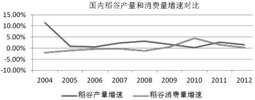 2003年以来,国内稻谷整体保持增产趋势。据国家统计局数据,2012年全国稻谷产量为20429万吨,较2011年增加328万吨,较2010年增加853万吨。与原粮相比,大米消费量虽有所增加,但增加幅度小于稻谷。2012年全国稻谷消费量为19600万吨,较2011年增加50万吨,较2010年增加350万吨。近几年来,除2010年稻谷消费增速高于产量增速外,其余年份均低于产量增速。稻谷产量的较快增加导致库存充足。