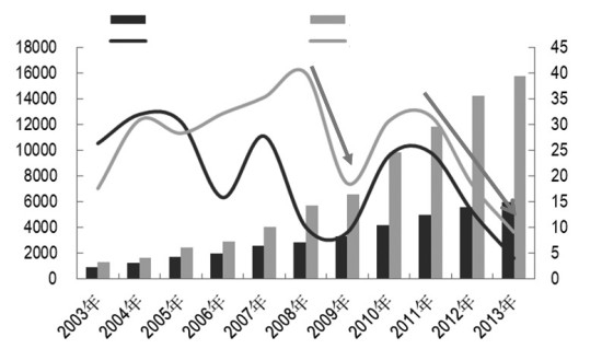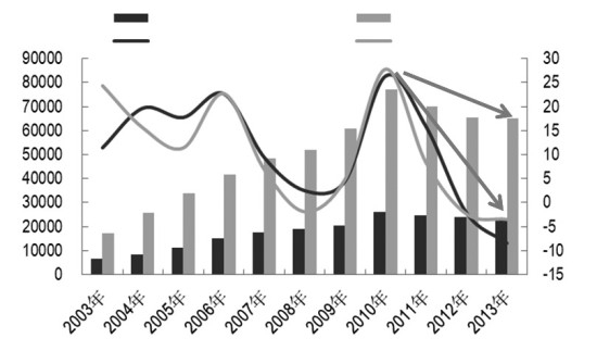 2013年我国家具总产量为65161.8万立方米,同比下降3.5%。木质家具产量占家具总产量的36.29%,其产量为23646万立方米,同比下降8.46%。木质家具产量下降幅度更大,对“两板”的需求影响更大,预计2014年木制家具仍会维持下降趋势,但下降幅度可能不会超过2013年。