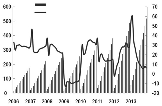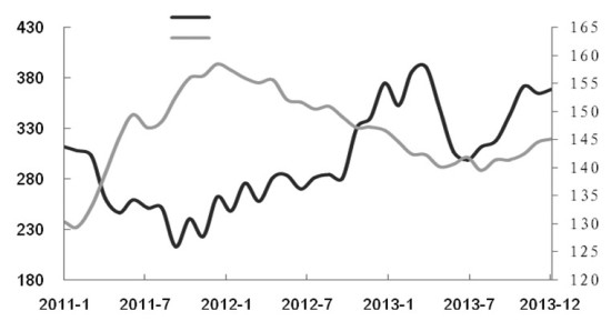 2013年美国CME木材期货主力合约收于370美元/千板尺附近,与2012年同期基本持平,而从我国鱼珠木材市场原木价格指数的走势来看,2013年走势比较平稳,较2012年同期小幅下跌。对比CME木材期货价格与鱼珠原木价格指数月度走势可以发现,两者相关度较低,CME木材期货价格对我国原木价格影响不大。