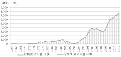 庞大的人口数量和稳定的经济增长促使印度食用油消费和进口持续增长,并迅速成为世界第一大植物油进口国,其中棕榈油在印度进口食用油中所占的比例最高,达到80%,但其工业消费占比不足10%。1994年,印度棕榈油进口量为480千吨,2011年为7250千吨,其中棕榈油的食用消费量1994年为465千吨,2011年为7100千吨,增长了约15倍。