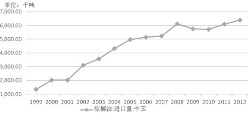 1999年,我国棕榈油进口量仅为1351千吨。2004年进口量达到5139千吨。1999年—2005年进口量增加了280%。自2006年免除棕榈油进口关税后,我国棕榈油进口数量保持增长态势,不过增速有所减缓。2011年,我国全年棕榈油进口量为6100千吨,较上年增长6.8%。预计2012年全年进口量将达到6400千吨,比上年增长约4.9%。