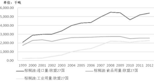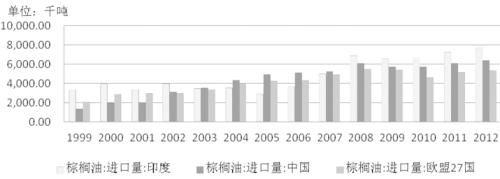 欧盟是全球棕榈油消费的第三大经济体,欧盟进口的棕榈油主要用于食用消费,但近年来随着生物柴油需求的增加,欧盟棕榈油工业消费用量增速已经超过食用消费。1999年,欧盟棕榈油进口量为2081千吨,到2011年进口量达到5200千吨,增长了2.5倍;1999年欧盟棕榈油食用消费量1748千吨,2011年食用消费量2550万吨,增长了1.5倍;1999年欧盟棕榈油工业消费量238千吨,2011年工业消费量2270千吨,增长了9.5倍。工业消费量的增长在欧盟棕榈油消费中所占的比例最高。随着生物柴油在欧盟国家的发展,棕榈油已成为继菜籽油之后的第二大主要原料。