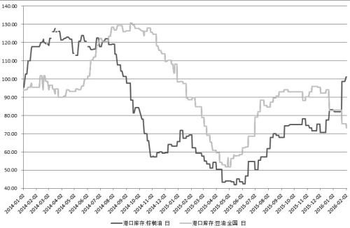 由于2015年11月、12月大豆进口数量较大,目前我国港口大豆库存偏高。截至2月1日,我国港口大豆库存为643万吨,虽比前期有所回落,但仍为历史同期偏高水平。由于年末消费趋旺,近期港口油厂的豆油库存下降速度较快(截至1月29日,豆油库存为76.9万吨,为四年来最低水平),但棕榈油库存却大幅增加(截至2月1日,棕榈油库存已经突破100万吨,达101.1万吨),豆油与棕榈油的合计量远超去年同期水平。此外,从2015年12月开始,为了降低菜油临储库存,政府每周三进行10万吨左右的菜油拍卖,增加了市场油脂供给,满足了市场需求。