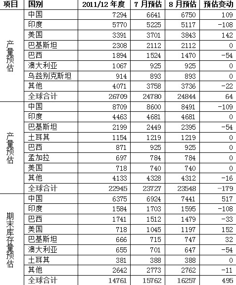 美国农业部在8月10日公布的月度供需报告将中国和美国2012/2013年度的棉花产量预估上调:2012/2013年度中国棉花产量预估为675万吨,上月预估为664万吨;美国2012/2013年度棉花产量预估为384万吨,上月预估为370万吨。印度棉花产量较上月小幅下调,最新预估数据位511.7万吨,上月预估为522.5万吨。全球棉花产量预估数据较7月上调,USDA对全球棉花产量最新预估为2484.4万吨,上月为2478万吨。在美国农业部月度供需报告公布前,市场普遍预计美国和印度棉花产量预估会因干旱天气而下调。