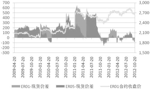 2012年稻谷市场现货强、期货弱的现象普遍,期现倒挂时有发生。在经历了7月、8月的走强之后,伴随着期货价格的走弱,早籼稻期现价差再次回到零线以下。除了2011年的极端情况,早籼稻1301合约的期现价差通常在-100元/吨以上的区间运行,现在期现价差已逼近-100元/吨的界限,价差下行趋势减缓,并开始有修复的迹象。