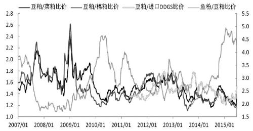 以华南地区为例,禽料为降低配方成本,常添加5%—8%的杂粕。目前,杂粕已经完全被豆粕所替代。水产料中的替代更加明显。淡水鱼料中,菜粕的添加量通常在20%—35%,现在已经降至15%,有的企业已不再使用菜粕。豆粕正以其较高的性价比,逐渐替代其他蛋白原料。2014年替代已经发生,2015年将愈演愈烈。