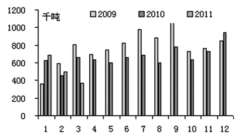我国三大植物油分月进口量