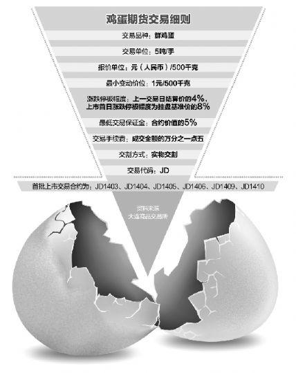 据了解,首批上市的鸡蛋期货(交易代码JD),包括JD1403、JD1404、JD1405、JD1406、JD1409、JD1410共六个合约,JD1403挂牌基准价为3800元/500千克,JD1405的挂牌基准价为4000元/500千克。