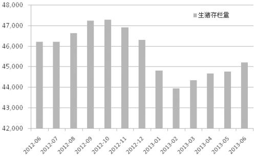 在国家扶持政策的支撑下,国内养殖业得以复苏发展。以生猪养殖为例,据中国农业部对全国480个农村集贸市场畜产品和饲料价格的定点监测,2013年6月份,全国活猪月平均价格14.10元/公斤,比上月上涨10.0%;猪粮比价为5.76∶1,比上月提高0.48个点。受养殖利润回升带动,国内生猪存栏量水平也持续回升。