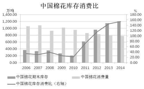 最新USDA报告显示,中国2014/2015年度棉花消费量为805.6万吨,期末库存1322.9万吨,库存消费比154%。我国棉花的消费量没有较明显的起色,期末库存再创高位,棉花库存消费比也居于近9年的高位。全球棉花期末库存增6%至2140万吨,库存比89%,库存可供全球使用近11个月。由此可见,国际和国内棉花市场供应和需求较宽松,棉花期现货价格不存在大幅上涨的动能。