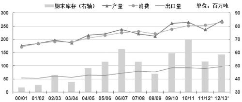 2011/2012年度,南美地区在连续两次拉尼娜现象之后遭遇严重干旱,导致大豆严重减产。世界大豆需求并未因宏观经济形势不佳而下降,因此在2011/2012年度,大豆供需开始出现缺口,世界大豆期末库存从历史最高水平跌至第四位。