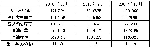 根据季节性规律,在美国大豆丰收后,市场把关注的焦点转移到消费。从11月份美国普查局发布的10月份美国大豆压榨数据看,美国大豆压榨量比去年同期下降了3.8%,而且从美国豆粕库存水平看,豆粕库存同比也上升了49%。压榨量减少、豆粕库存上升,说明美国豆粕消费或者出口是比较差的,美国大豆消费并没有预期的那么乐观。另外,从美国大豆的出油率来看,今年的出油率为11.39磅/蒲,比去年的11.19磅/蒲的水平要高,这说明今年大豆的出油率较高,供应短缺的局面将会有所缓解,只是缓解的幅度不会大。