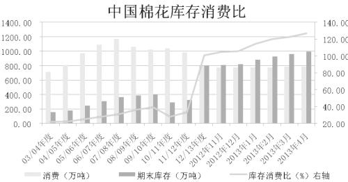 最新美国农业部供需报告再次上调了2012/2013年度中国棉花的期末库存量至993.06万吨,环比增加32.66万吨,增幅为3.4%,而产量及消费总量则维持不变,则本年度中国棉花的库存消费比达126.69%,继续上升并再创历史新高。棉花库存消费比再攀高位,说明棉市供需过剩格局在延续,且国内近1000万吨的巨大库存量是主因。