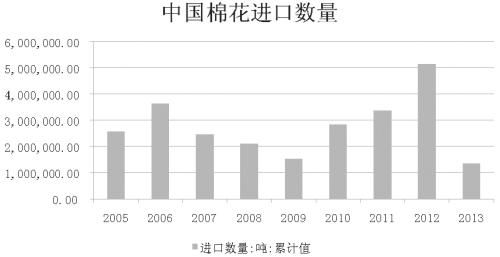 据中国海关统计,2013年3月份,我国进口棉花52.88万吨,环比增加15.01万吨,增幅为39.63%,但同比减少9.55万吨,减幅为15.3%。且今年1—3月份,我国累计进口棉花136.51万吨,同比也减少20.22万吨,减幅约12.9%。另外,2011年和2012年两个自然年度棉花累计进口量分别达336.50万吨、513.77万吨,同比均大幅增加。分析认为,稳定棉价需抑制棉花进口,且经过前两年大规模进口棉花后,预计本年度棉花总进口量将降至350万吨左右水平。