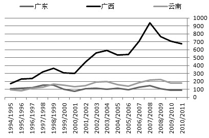 综合过去10余年以来三大主产区的数据,我们认为2010/2011榨季蔗糖主产区产糖量总体低于此前市场的预估,但分地区来看,广东及云南产量分别达到了87.19万吨和178万吨,略高于2009/2010年的85.77万吨和177.15万吨,为增产榨季。广西地区产糖672.8万吨,低于去年的712万吨,这可能是由于去年年底以来该地区部分蔗地遭受冻害等灾害天气所致,其减产产量大于广东以及云南地区的增产量总和。