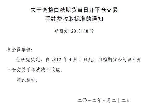 经研究决定,自2012年4月5日起,白糖期货合约当日开平仓交易手续费减半收取。 特此通知。